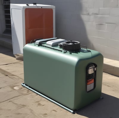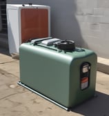 A large white cylindrical tank labeled '550 GAL INDUSTRIAL WASH WATER' sits on a concrete platform. The tank has pipes attached at the top and is surrounded by grass and gravel. Behind the tank, there is a fence and railcars, with some trees visible in the background.